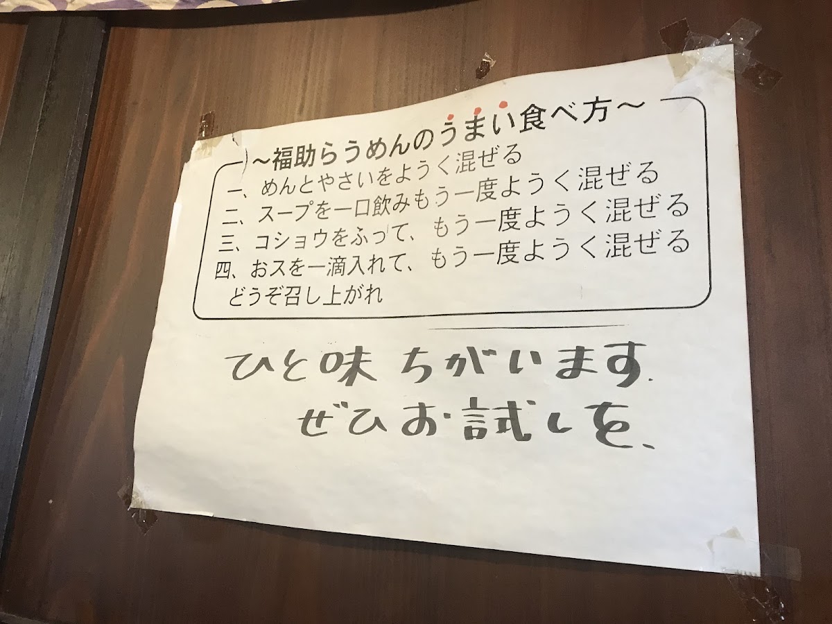 “ 平日の昼に伺いました。券売機で食券を買い、店員さんが食券を受け取る時に野菜増しや麺の硬さなどをオーダーします。 いつもの福助ラーメン並を注文。店主が一杯一杯お客様の要望に丁寧に応えるように作りますので、着丼までは時間が少しかかります。ニンニクは別の机に置いてあるので、自分好みに盛ることができます。 麺と野菜のバランスが良いので、食べ終わりにどちらか残る事が無く完食できました。また近くに行ったら食べたいと思います。 ”