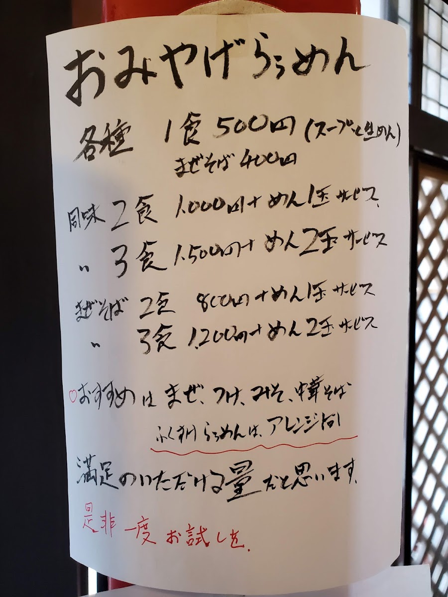 “ ▫福助らぅめん大 たまごメンマ ¥950 ▫まぜそば 大 たまごメンマ ¥950 ▫つけ麺 大大 たまごメンマ ¥1000 病気されてた店主が昨年復帰され、昼営業メインで復活。 食券制。 基本のラーメンのサイズは【小小→並→中→大→大大】とかなり細分化されてますので女性や少食の方でも安心。 ヤサイニンニクアブラの無料トッピングは食券受け渡し時に言います。(マシや少なめ、抜きなど) 何も言わないと全て普通になります。 福助らぅめん、どことなく懐かしさもあるようなスープ。良い意味で二郎インスパイア系らしさがない、あっさり系マイルド豚骨醤油。 麺は太めの角麺で弾力の強いワシワシ系。 味付きアブラと黒胡椒が上に載る。 チャーシューはラーメンのサイズによって量が変わるようです。(小小~並1枚、中2枚、大3枚~…) 残さず食べれる自信のある方は中のサイズ以上をオススメ。見た目のボリューム以上に食べやすいラーメン。 以前は細かいチャーシューでしたが、1枚スライスになり食べごたえがあってこっちの方が好み。 ヤサイはモヤシメインでややシャキ。茹で卵は固茹でタイプ。 まぜそばは所謂汁なしのタイプではなく、スープがどんぶりの半分ほど入っているタイプ。ベースは福助らぅめんのスープと同じように感じましたが、紅生姜、魚粉が加わる。 また、まぜそば注文者のみ別卓の辛揚げ・ガリマヨ等のトッピングを利用可能。 つけ麺は節系魚介豚骨。冷か温盛りで選べます。具はシンプルにチャーシューのみ。 スープは王道ながら間違いないタイプ。 麺量は大大サイズで茹で前350~400g?くらいでしょうか 大大だとチャーシューがゴロゴロ入っていてめちゃお得。たまごメンマはつけ麺には必須級に相性が良い。 土曜でしたが、開店前には7~8人の行列もあり、年齢性別問わず地域に愛されるお店。 二郎インスパイア系ながらレトロな内装も相まって、居心地の良い雰囲気。家族連れでの来店も多く、ギスギス感は皆無。 600円から食べれて、価格もとても良心的だと感じます。 ”